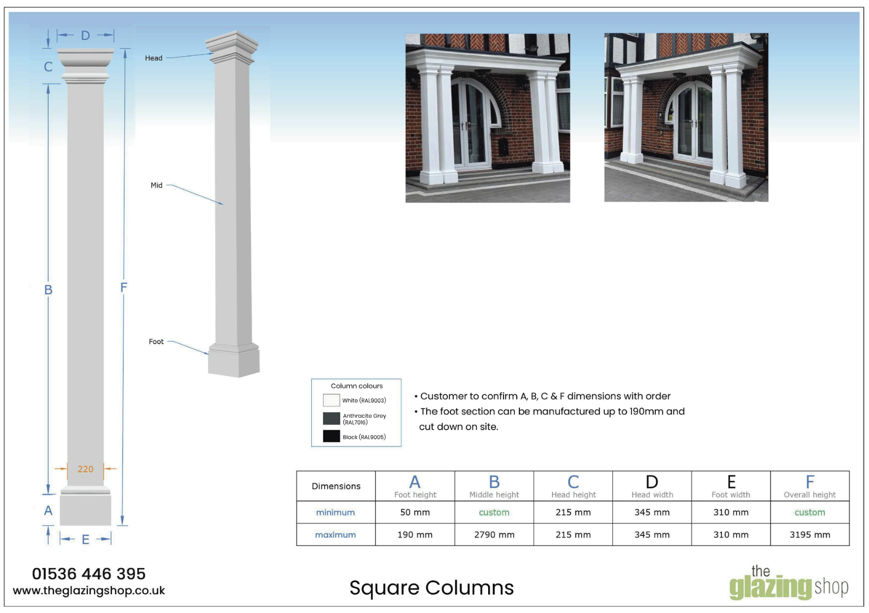 The columns have a maximum height of 3195mm and are made to your bespoke sizes for a perfect fit. The foot and mid-section dimensions can be custom made for you within the parameters shown on the specification sheet. The foot section can also be trimmed on site.